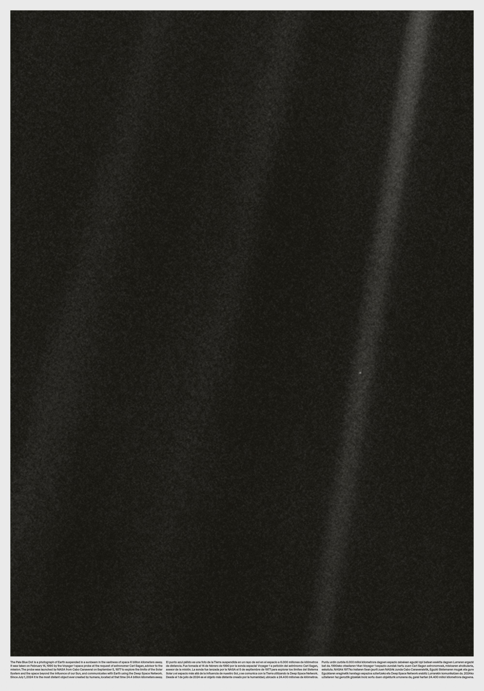 [ENG] —The Pale Blue Dot is a photograph of Earth suspended in a sunbeam in the vastness of space 6 billion kilometers away. It was taken on February 14, 1990 by the Voyager 1 space probe at the request of astronomer Carl Sagan, advisor to the mission. The probe was launched by NASA from Cabo Canaveral on September 5, 1977 to explore the limits of the Solar System and the space beyond the influence of our Sun, and communicates with Earth using the Deep Space Network. Since July 1, 2024 it is the most distant object ever created by humans, located at that time 24.4 billion kilometers away.